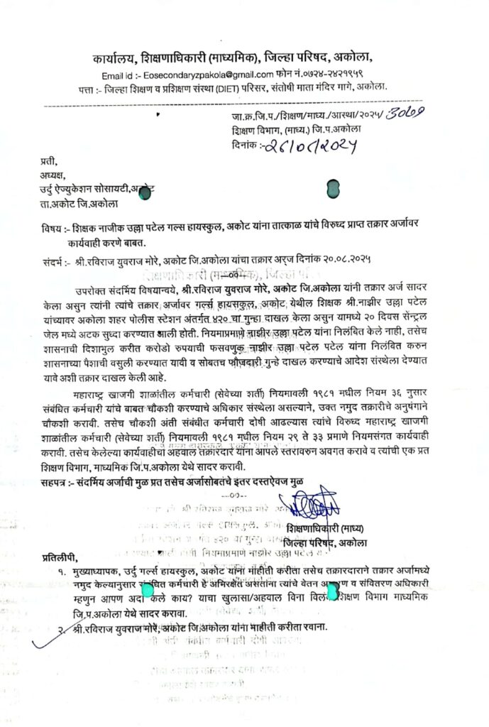 “नाझीर उल्ला पटेल यांची जेल कस्टडीत असतानाची नोंद तपासली जाईल. कर्तव्यात कसूर व शासनाची दिशाभूल केली असल्यास तातडीने निलंबनाची कारवाई केली जाईल त्यानुसार सविस्तर अहवाल मुख्याध्यापकाला सादर करावा लागेल.” असे आदेशात नमूद आहे
